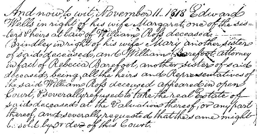 This document (excerpt below), a record of an Orphans Court held at West Chester, Chester County, Pennsylvania, stands as perhaps the most convincing proof of the family connections of Rebecca (Ross) Barefoot, and gives some clue to the date of death/disappearance of Benjamin Barefoot, Rebecca's husband. An Orphans Court was peculiar to Pennsylvania and was the court that handled probate matters. William Ross had died intestate (without a will) in February 1818, leaving a widow, Mary, and no children. His three surviving siblings, Margaret Wells, Mary Brinley and Rebecca Barefoot, petitioned the court to give them shares of his estate. William Barefoot, Rebecca's son, served as attorney in fact for Rebecca in this matter (women had limited legal authority in this period), which would strongly suggest that her husband Benjamin was not available to represent her interests. The last evidence of Benjamin's existence is the 1800 Federal Census for Fayette County, Pennsylvania.